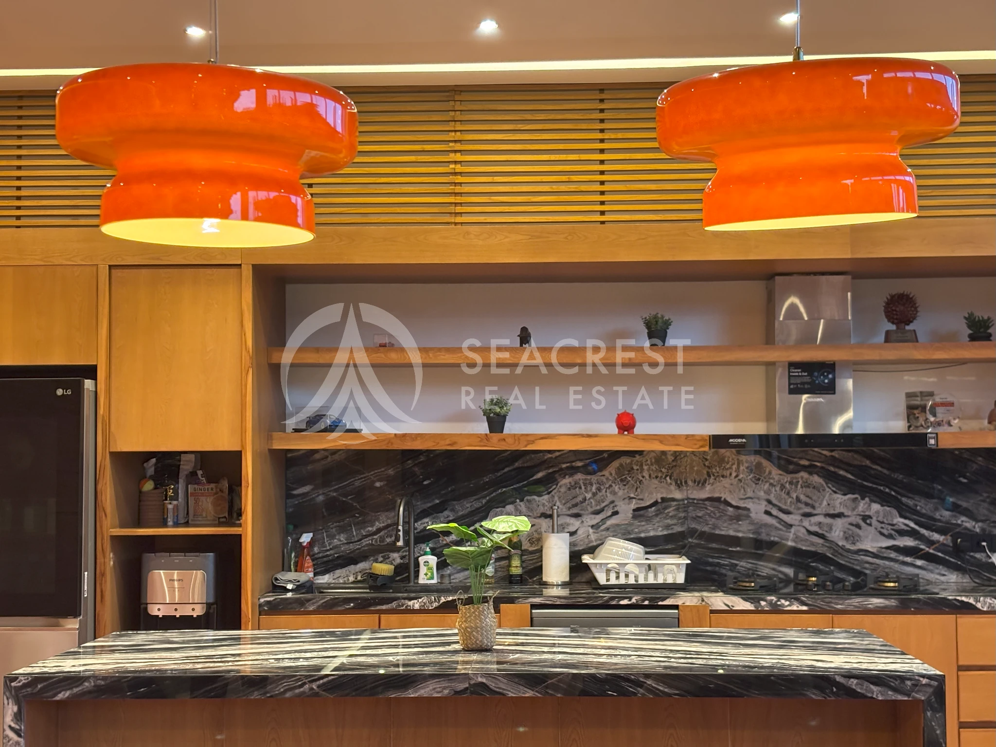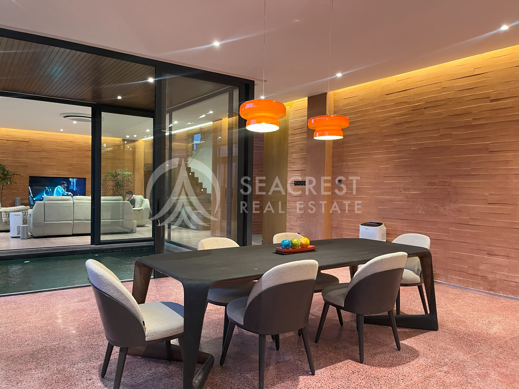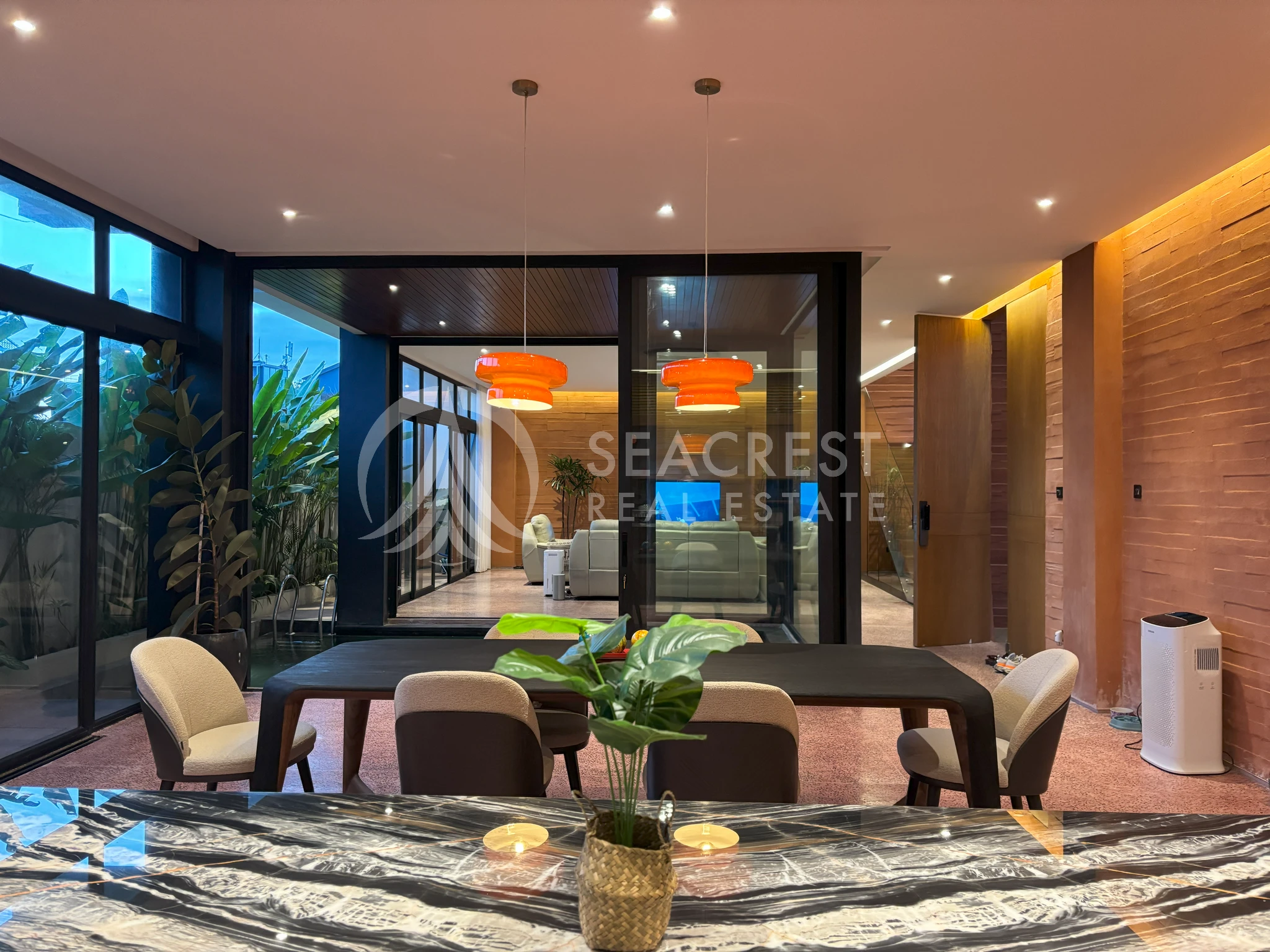 At the center of the home lies a glass-covered heated pool, bringing warmth and natural light into the heart of the villa. The ground floor is fitted with Brazilian marble, Italian leather furnishings, a full entertainment setup, and premium kitchen appliances. Upstairs, three spacious bedrooms offer full privacy and comfort—featuring luxury latex beds, blackout curtains, and elegant custom lighting. A handcrafted copper bathtub adds a unique touch of indulgence, while Dyson and Samsung air filters ensure a clean living environment throughout.