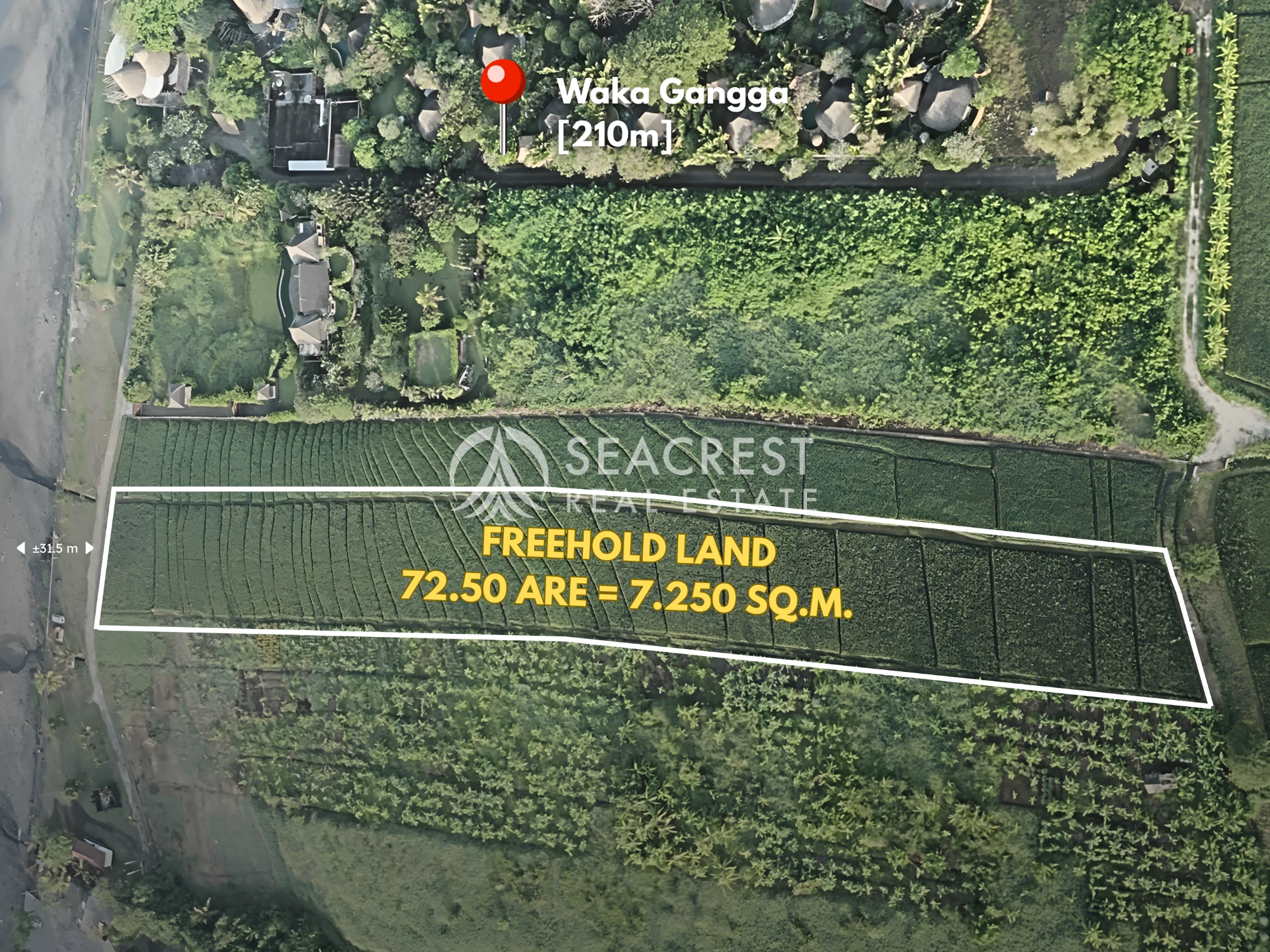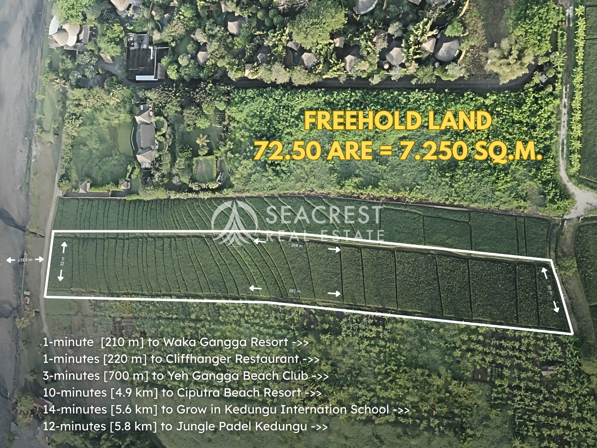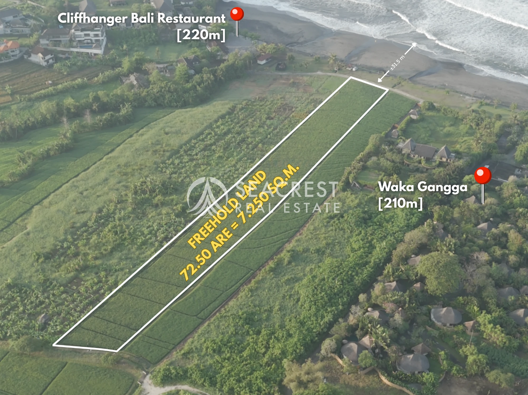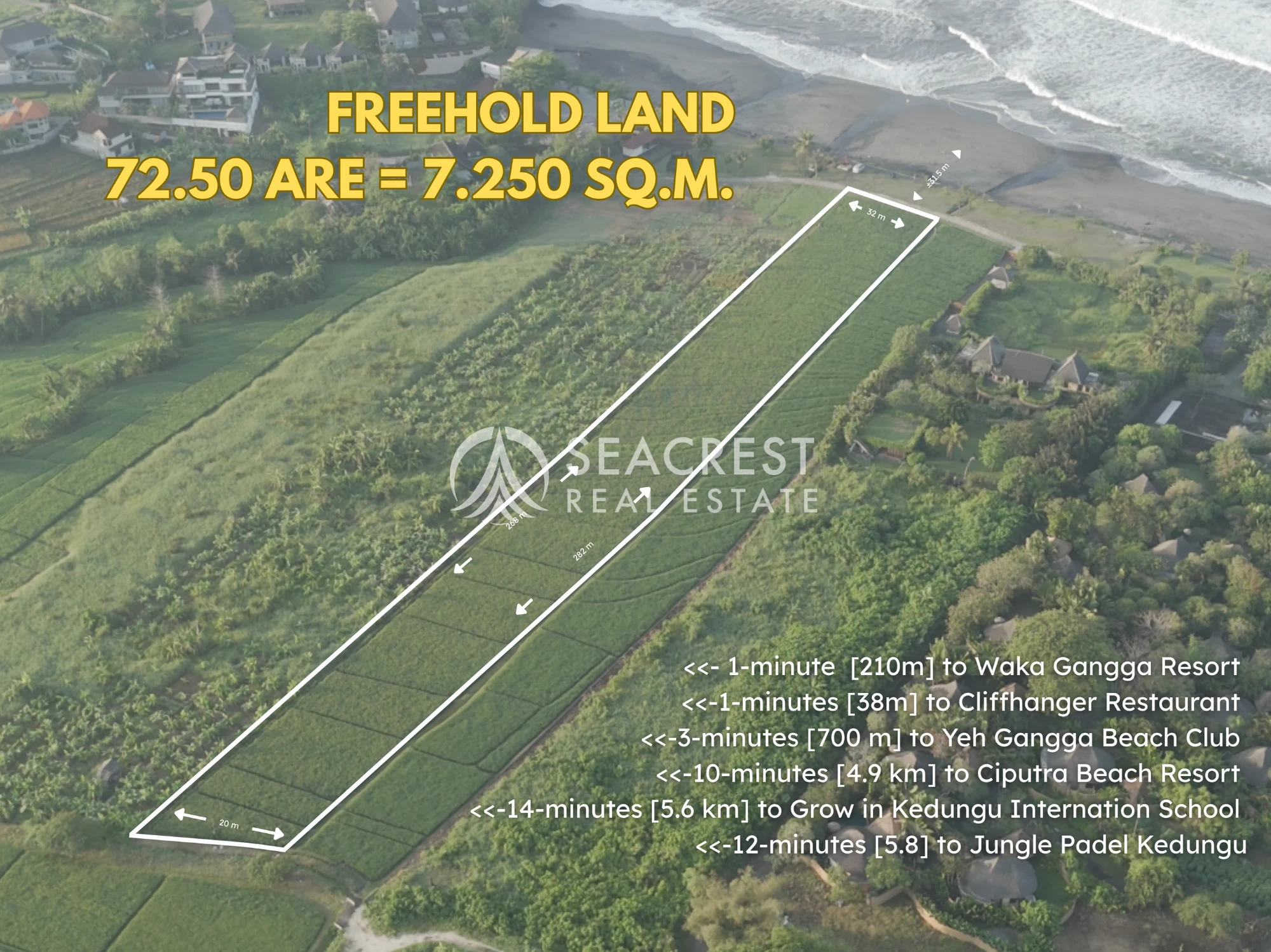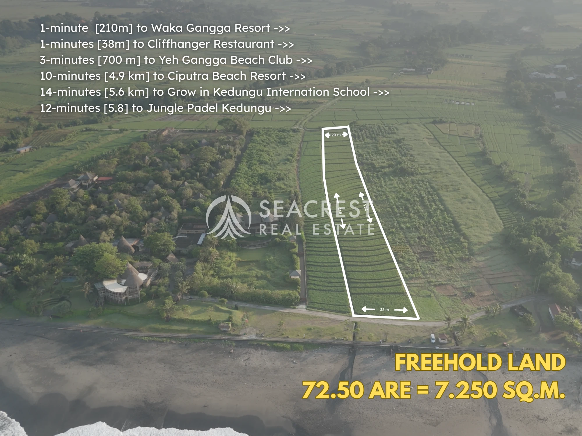 Surf & ocean dynamics ; The beach is known as the next surfing spots after Batu Bolong beach and Kedungu Beach. With approximately 31.5 meters of direct ocean frontage, stretching inland for about 268 meters with a back width of 20 meters, the land offers both striking coastal presence and generous length for versatile development.