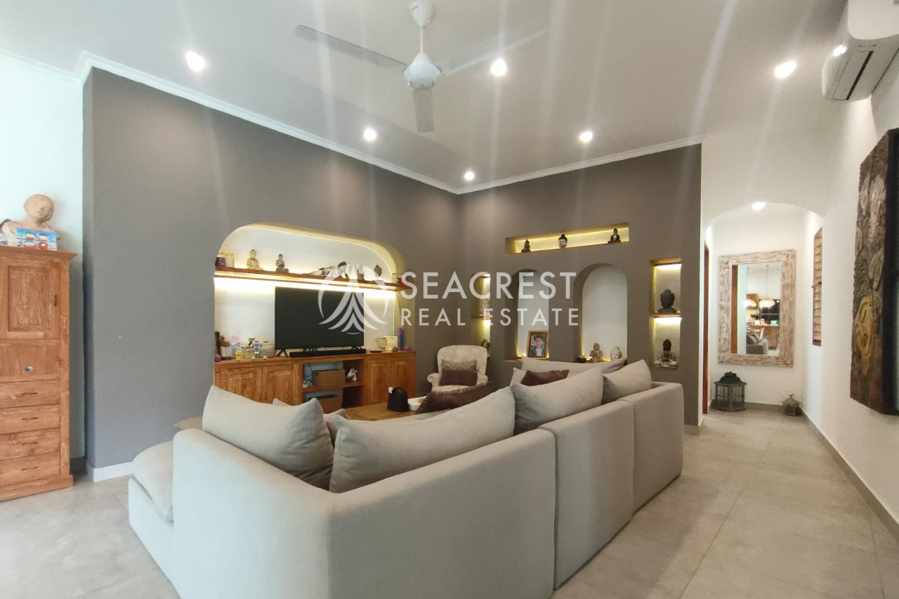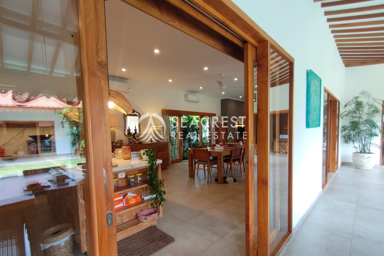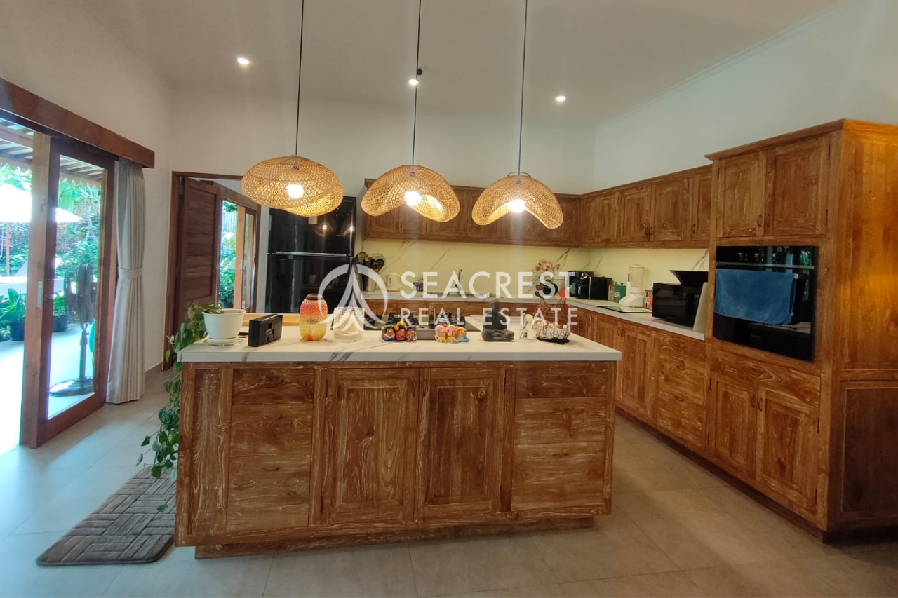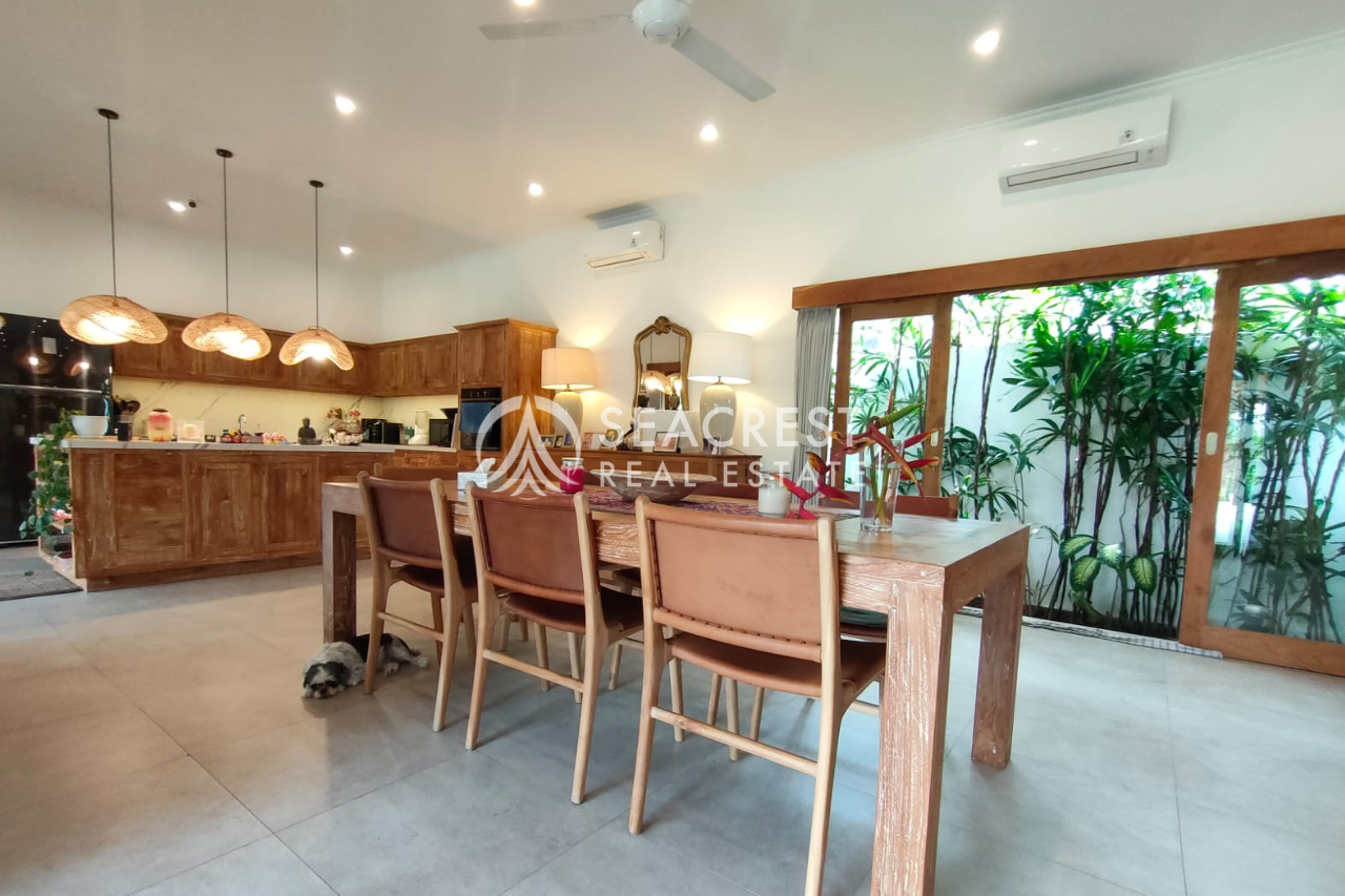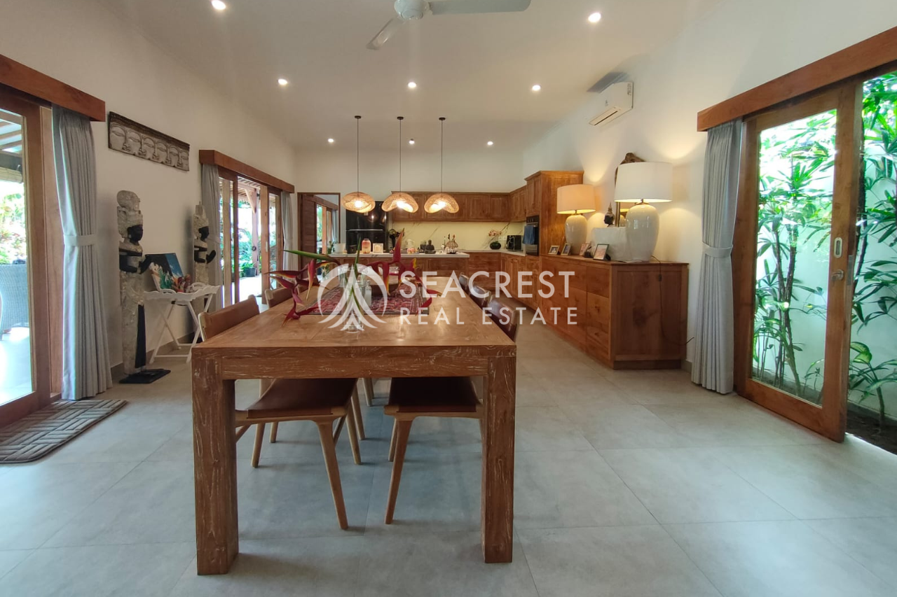 This beautifully crafted leasehold villa offers a harmonious blend of rustic charm and tropical living, ideal for families looking for a comfortable home in Bali. Built with natural materials and designed with generous spaces, the villa provides a cozy yet airy atmosphere with plenty of natural light throughout. The layout includes an enclosed living and dining area, creating a safe and functional environment for everyday life. The villa’s design highlights warm wooden accents, high ceilings, and a seamless flow between indoor and outdoor spaces. Large windows and sliding doors invite plenty of natural light and fresh air, creating a cozy yet airy ambiance throughout the home.